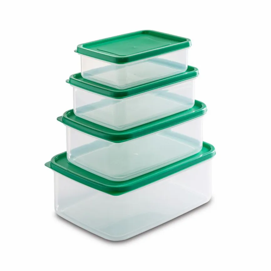 Dank des Sets Vorratsdose 4tlg. herrscht ab sofort Ordnung im Kühlschrank und nicht wiederverschließbare, angerissene Originalverpackungen gehören der Vergangenheit an. Ganz egal, ob es um Aufschnitt, Fleisch oder Gemüse geht, Sie können Lebensmittel organisiert und hygienisch verstauen. Auch für übriggebliebene Spezialitäten vom Festbüfett ist das Set Vorratsdose 4tlg. hervorragend geeignet.