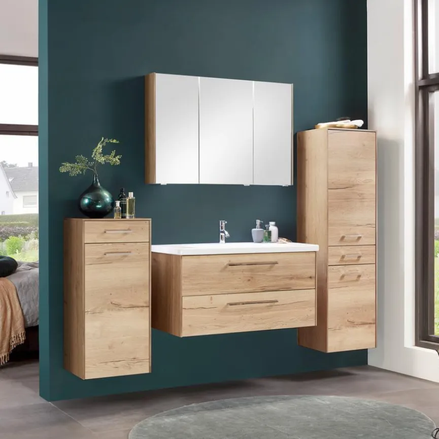 - Inkl. Waschtisch-Unterschrank inkl. Aufdopplungsseiten 10mm, mit 1 Schubkasten und 1 Auszug