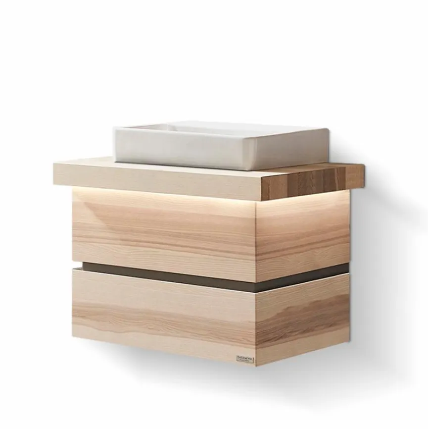 - Waschtischplatte aus massiver Strukturesche, Becken Keramik weiß, Becken eingelassen mit Armaturbohrung ohne Überlauf, 1 Raumsparsiphon, 1 Permanentablauf inkl. Abdeckung in chrom (nur mit nicht verschließbaren Ablaufventilen kombinierbar)