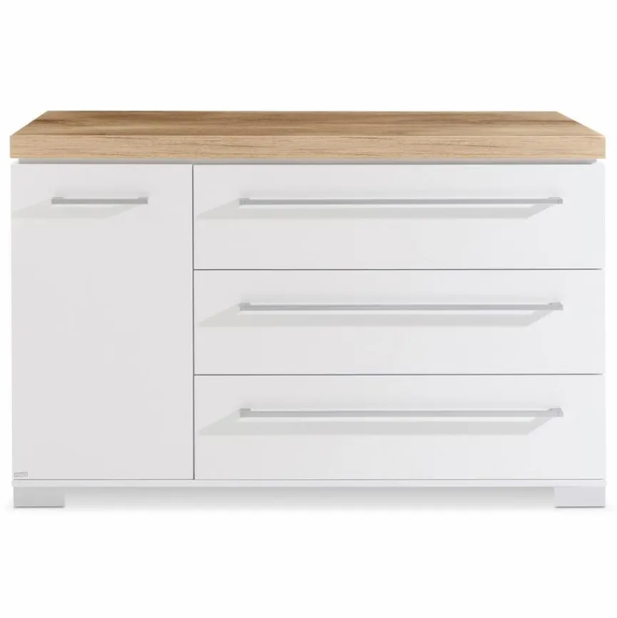 - Aus Spanplatte mit kratzfester Melaminharzfolie in Kreideweiß, Absetzung in Eiche Nebraska