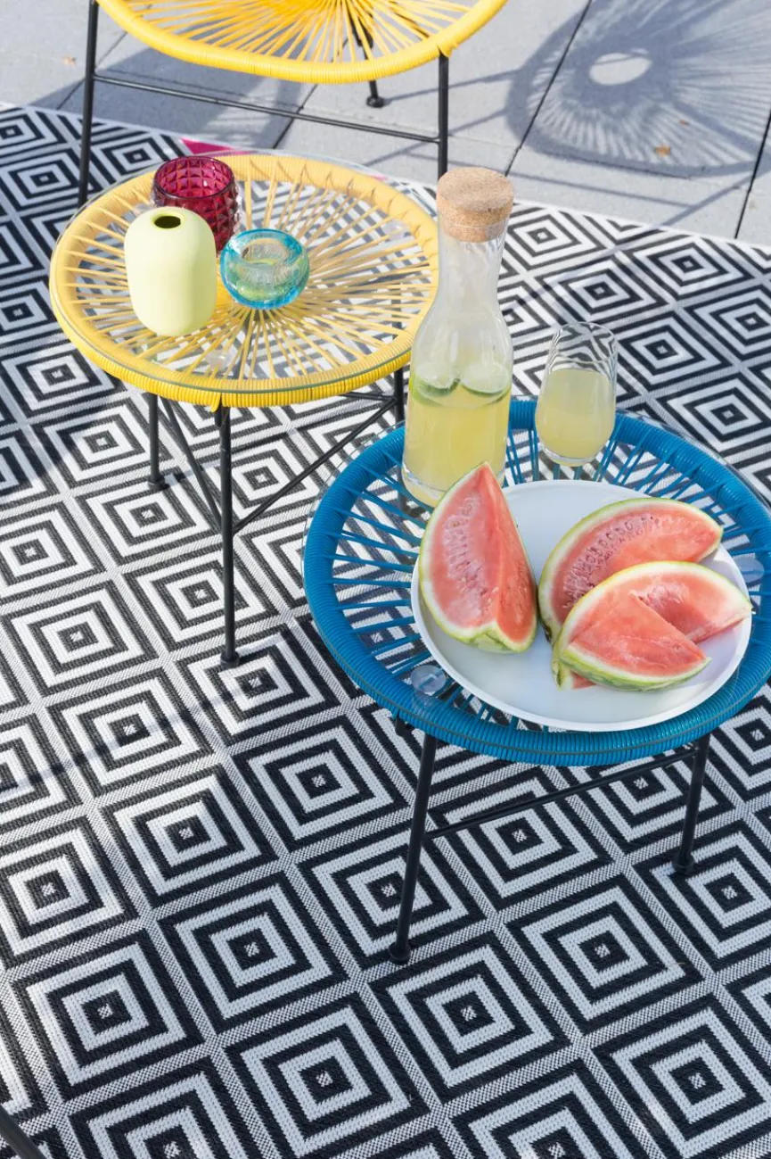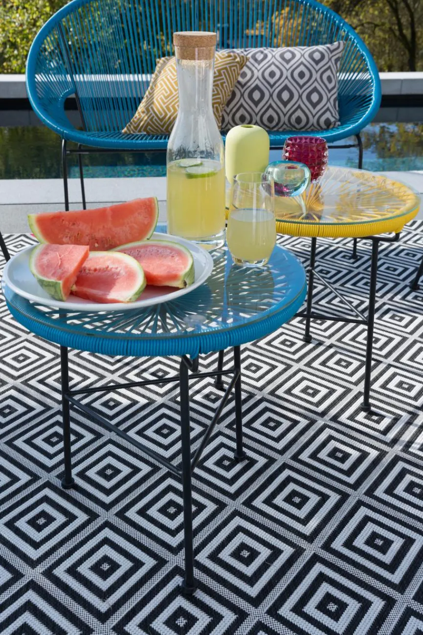Wer es draußen gerne bunt und exotisch mag, wird den Balkontisch Egg ⌀ 45 cm gewiss in sein Herz schließen. Ein filigranes, schwarzes Gestell mit drei Beinen sowie ein oberer Teil mit farbenfrohem Geflecht und einer Glasplatte machen den Balkontisch Egg ⌀ 45 cm zum Eyecatcher.