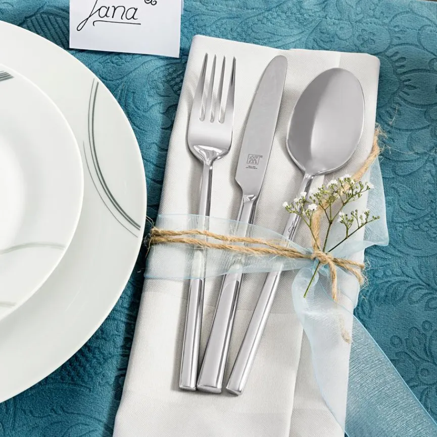 - Je 12 Messer, Gabeln, Löffel, Kuchengabeln, Kaffeelöffel, je 2x Fleischgabeln, Servierlöffel, je 1x Suppen-/Sahnelöffel, Saucenlöffel, Tortenheber, Zuckerlöffel