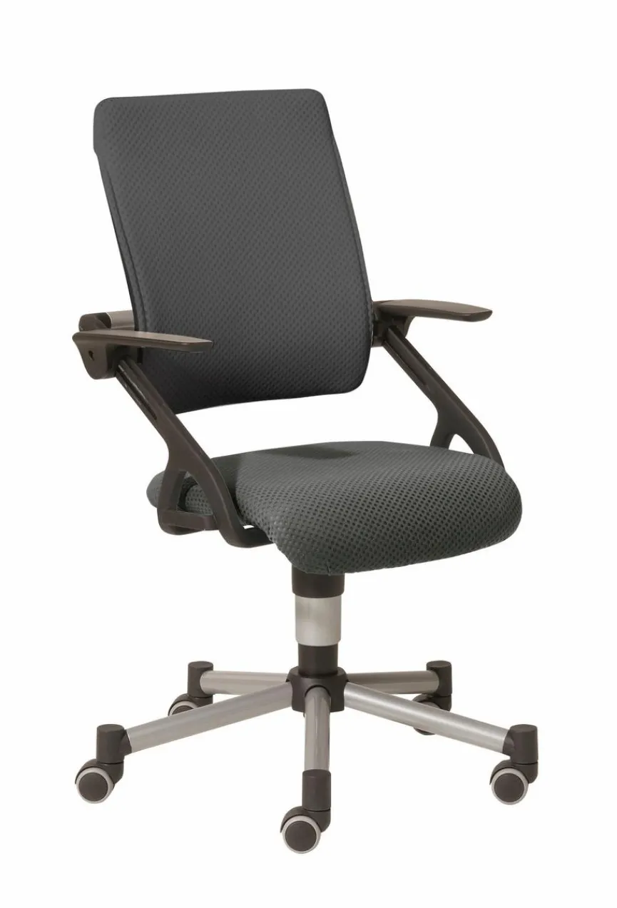- Sitz aus Stoff in grau, Rücken aus Stoff in grau , Gestell/Fußkreuz aus Kunststoff in silbergrau, Armlehnen aus Kunststoff in schwarz