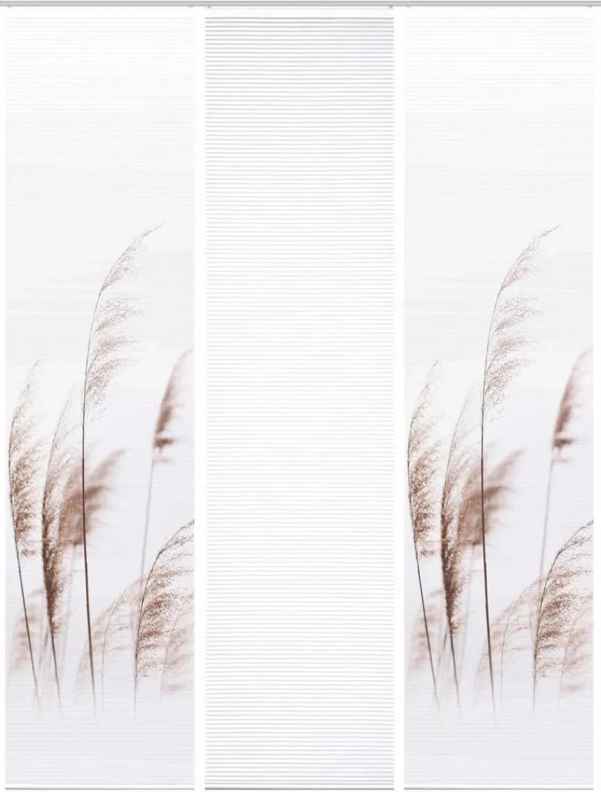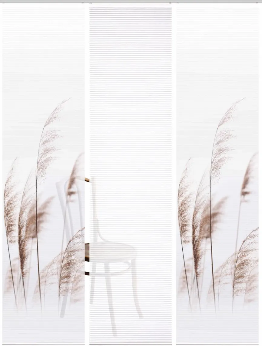 - Artikel beinhaltet einen unifarbenen und zwei gemusterte Schiebevorhänge, Paneelwagen inkl. Gleiter und Aluklemmleiste