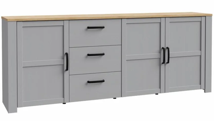 - Rückwand besteht aus Holzwerkstoff (HDF) in Eiche Grau, Korpus besteht aus Holzwerkstoff (Spanplatte) in Eiche Grau. Front besteht aus Holzwerkstoff (Spanplatte/MDF) in Eiche Grau. Absetzung in Riviera Eiche mit Kratzfester Melaminharzfolie