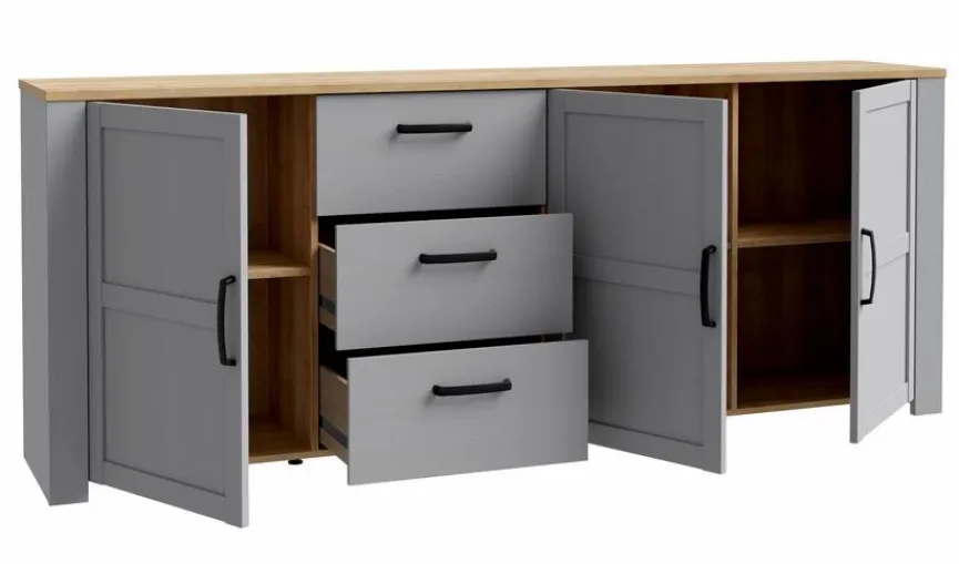- Mit 3 Türen, 3 Böden und 3 Schubkästen