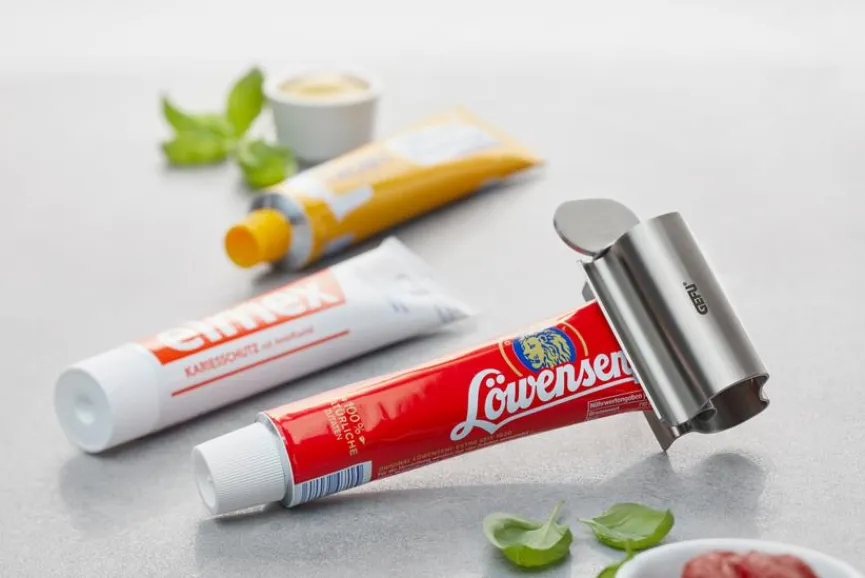Foodies, Kosmetikliebhaber oder auch Bastler – alle sind vom eleganten Tubenquetscher Sqeezy von GEFU gleichermaßen fasziniert und begeistert. Egal, ob für Tomatenmark, Cremes oder sogar Klebstoff, mit diesem stilvollen Tubenausdrücker gelingt leicht das nahezu restlose Entleeren. In modernem Design ist der Tubenquetscher Sqeezy ein charmantes Accessoire, was ihn nicht nur zu einem effektiven Haushaltsartikel, sondern auch zu einer charmanten Geschenkidee oder zu einem lustigen Mitbringsel macht.