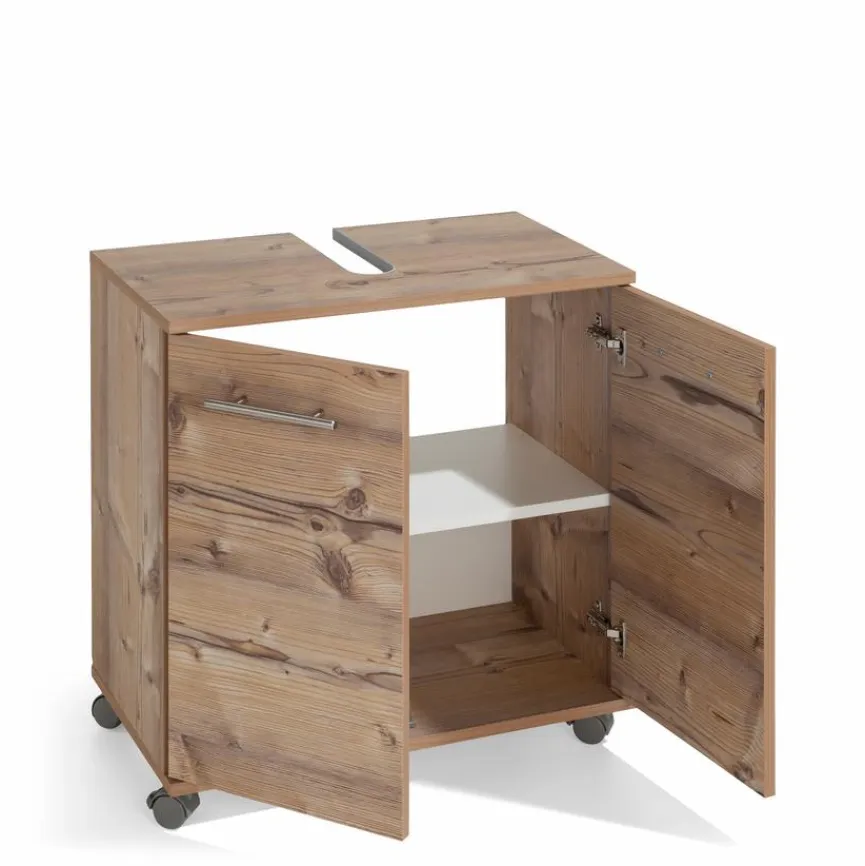 Der Waschbeckenunterschrank Isola sieht umwerfend aus und ist nicht nur praktisch, sondern verleiht Ihrem Bad das gewisse Etwas. Im Schrank selbst finden allerlei Utensilien wie Handtücher, Zahnpasta oder Haarshampoo problemlos Platz. Leichtgängige Rollen machen den Unterschrank besonders flexibel.