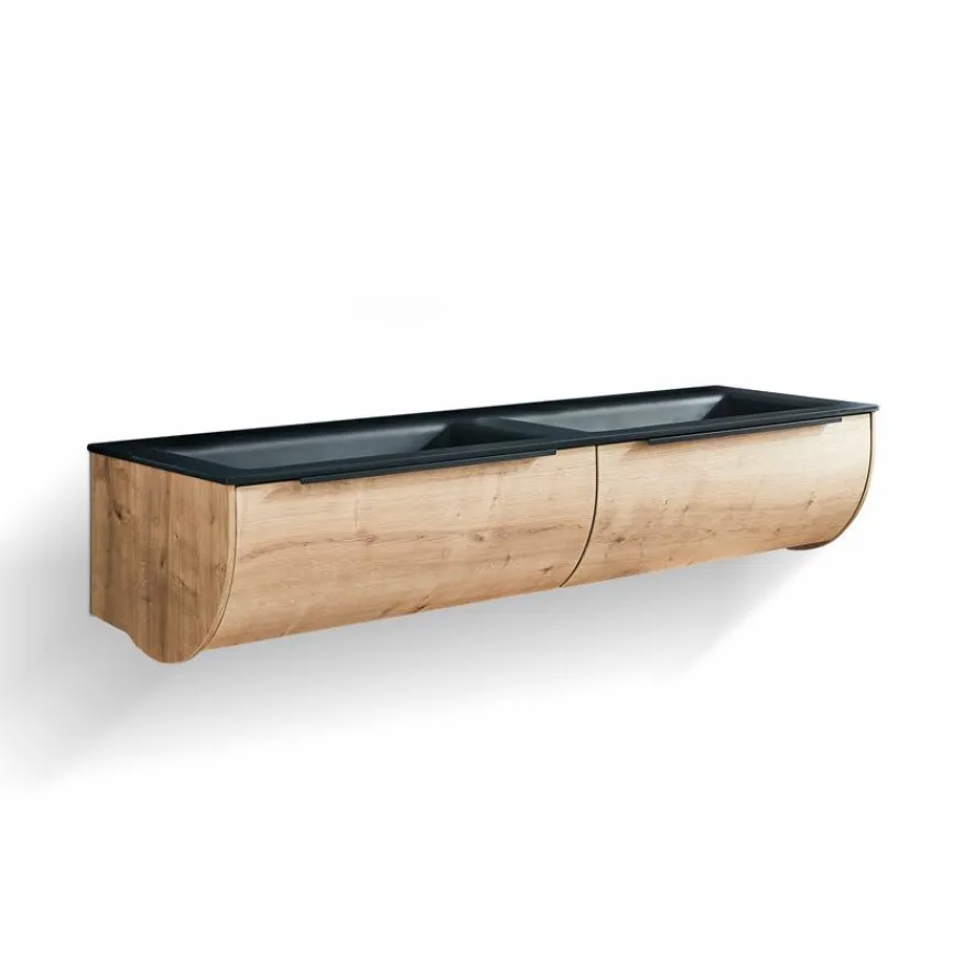 - Kombination bestehend aus Waschtischunterschrank mit 2 Metallauszügen mit Einzugsdämpfung und Siphonausschnitten und 1 Doppelwaschtisch aus Glas in schwarz matt mit 2 Hahnlöchern und 2 Clou Ab- und Überlaufsystemen