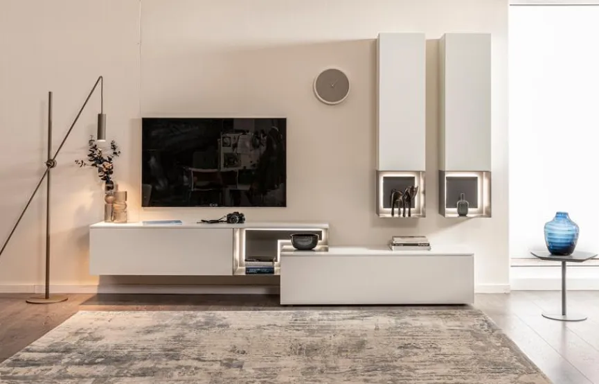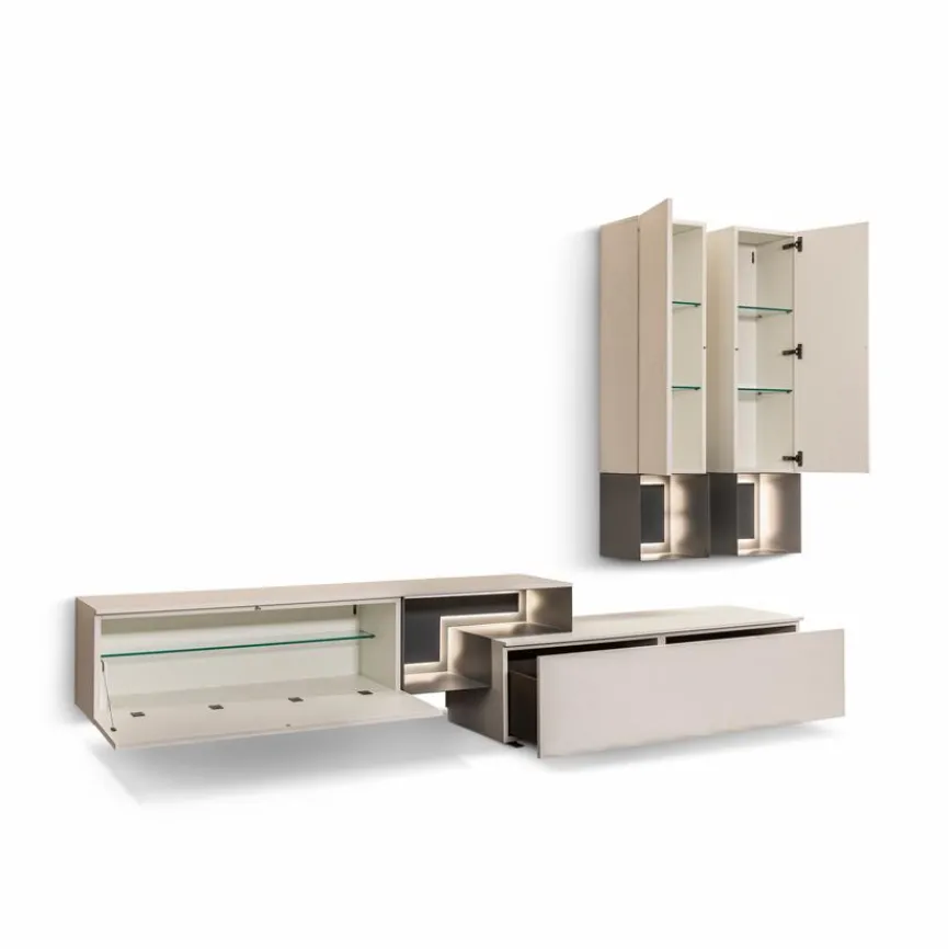 - Wohnwand bestehend aus: 1 Lowboard, 1 Hängelowboard, 2 Hängevitrinen