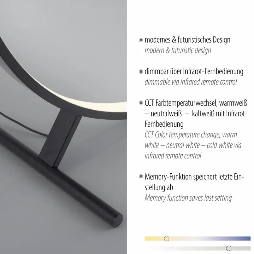 Eine schnörkellose, schlank gezeichnete Ringform macht die LED-Tischleuchte Hula aus dem Hause Paul Neuhaus zum Eyecatcher. Die dimmbare LED-Tischlampe, die gut in ein minimalistisches Ambiente im modernen Stil passt, ist unter anderem mit einer Memory-Funktion ausgestattet. Steuern lässt sich die LED-Tischleuchte Hula via Infrarot-Fernbedienung.