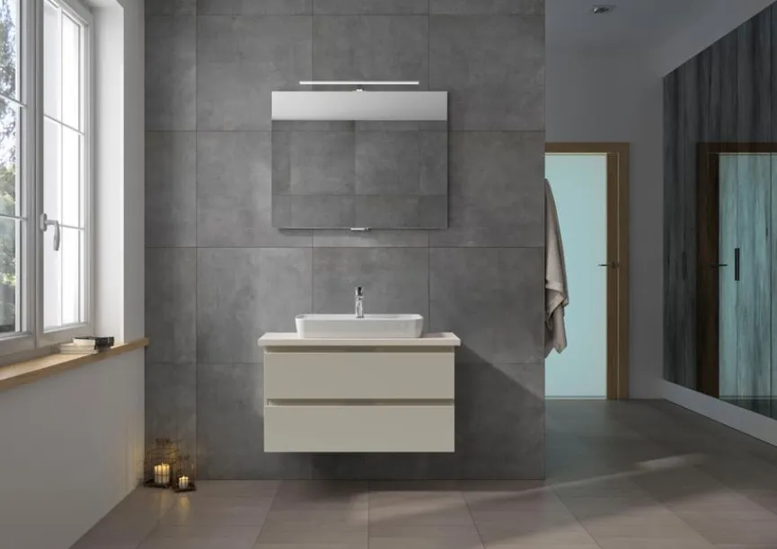 - Bestehend aus: Spiegel mit Beleuchtung, Keramik-Aufsatzbecken, Waschtischplatte und Waschtischunterschrank