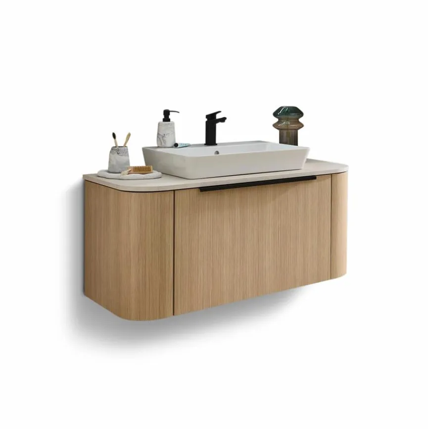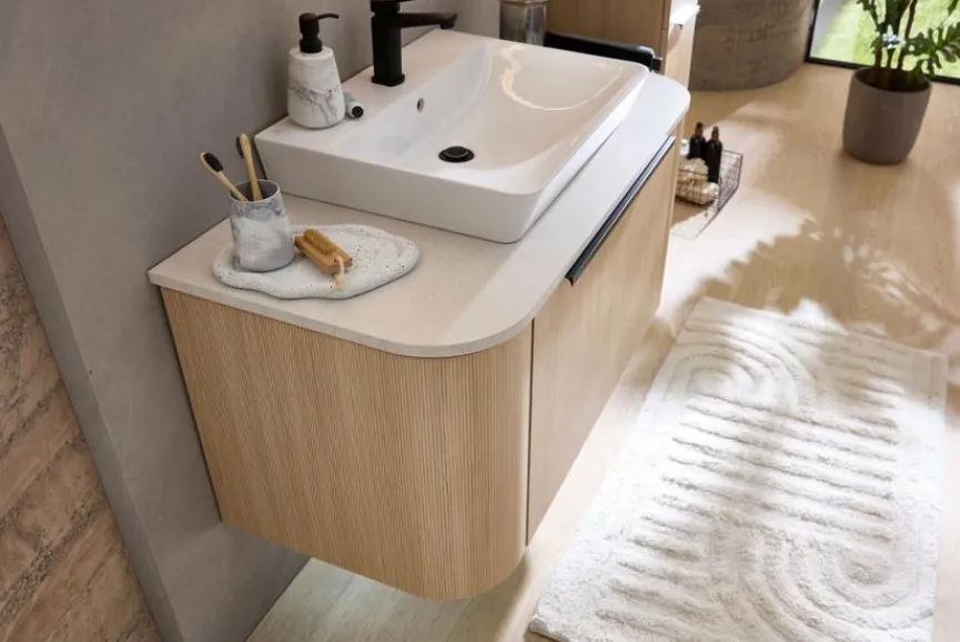 - Mit Waschtischplatte inklusive Ausschnitt für Aufsatzbecken, Verbundplatte mit Schichtstoff belegt, Ausführung Sandstein Struktur Nachbildung