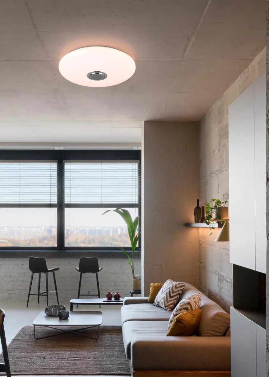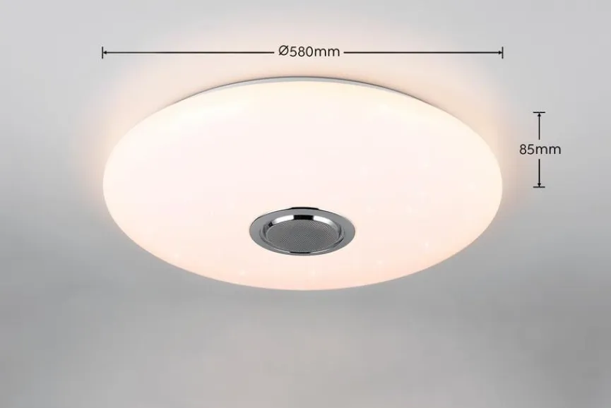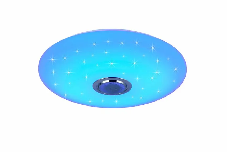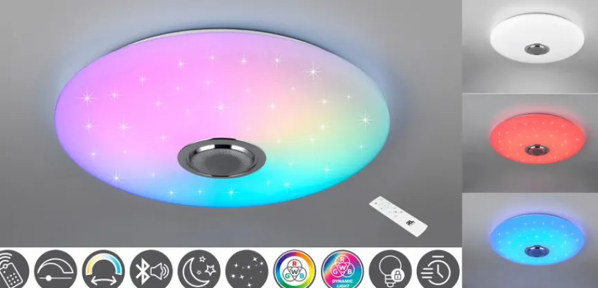 - Mit Fernbedienung zum Dimmen, Einstellen der Farbtemperatur (2.700 bis 6.500 Kelvin), Veränderung der Lichtfarbe (RGB) und Bedienung des Bluetooth-Lautsprechers