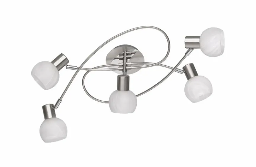Die tolle Deckenleuchte ANTIBES der Marke Reality Leuchten ist mit ihrem edlen Design ein wundervoller Blickfang in jedem Wohnbereich. Ihre geschwungene Gestalt und die attraktive Kombination von hochwertigem Metall mit weißen Gläsern verleihen dieser Deckenlampe einen modischen Touch. Mit der 5-flammigen Deckenleuchte ANTIBES von Reality Leuchten kann ein Zimmer perfekt ausgeleuchtet werden. Zusätzlich sorgt die Lampe für ein modernes Wohnambiente.
