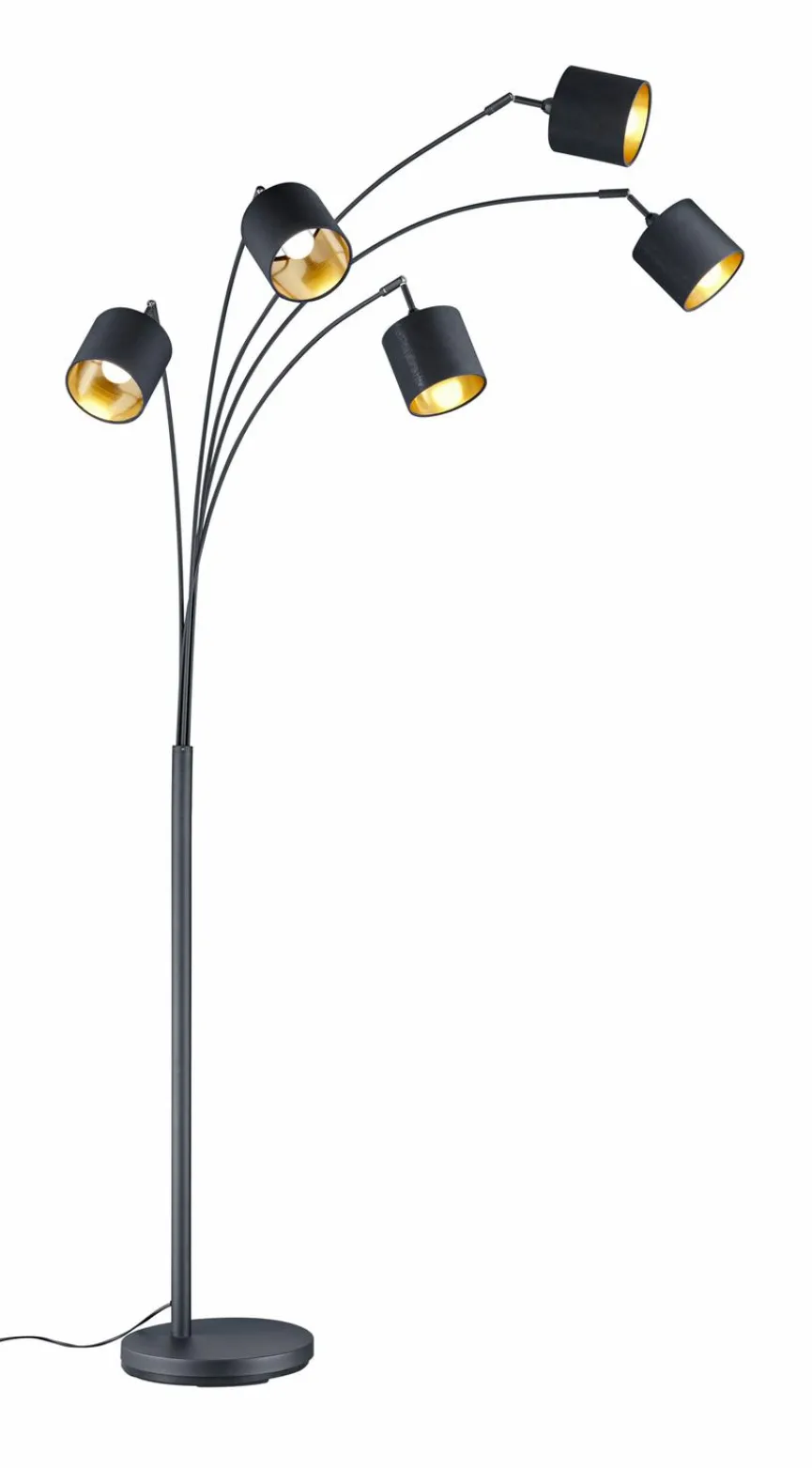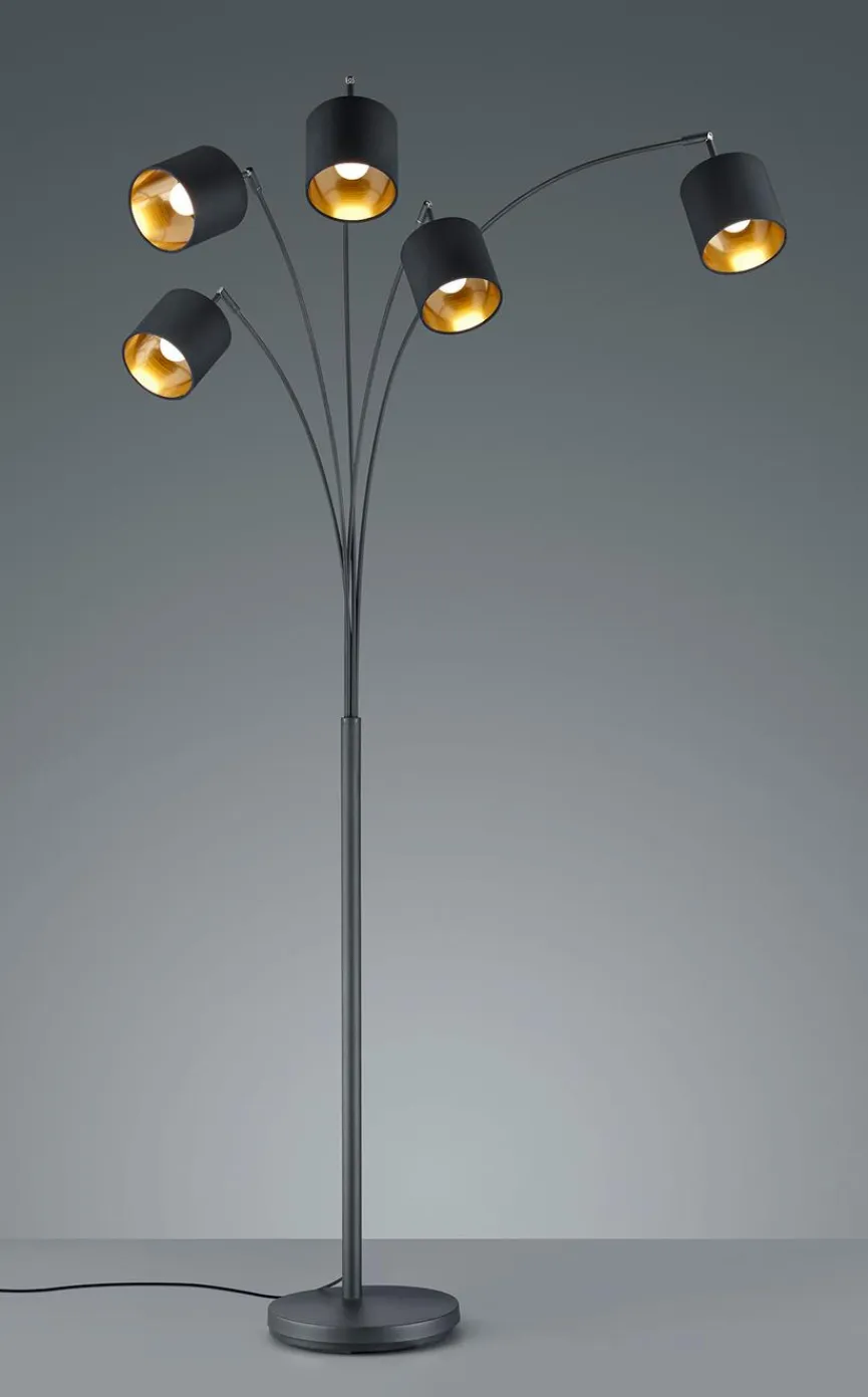 Die Stehlampe Tommy der Marke Reality Leuchten dient als perfekte Ergänzung zur Sitzgruppe. Die fünfflammige Stehleuchte reflektiert das Licht mit dem goldfarbenen Inneren der Schirme auf besonders angenehme Weise. Gerne wird man sich zum Lesen neben die Stehlampe Tommy von Reality Leuchten setzen.