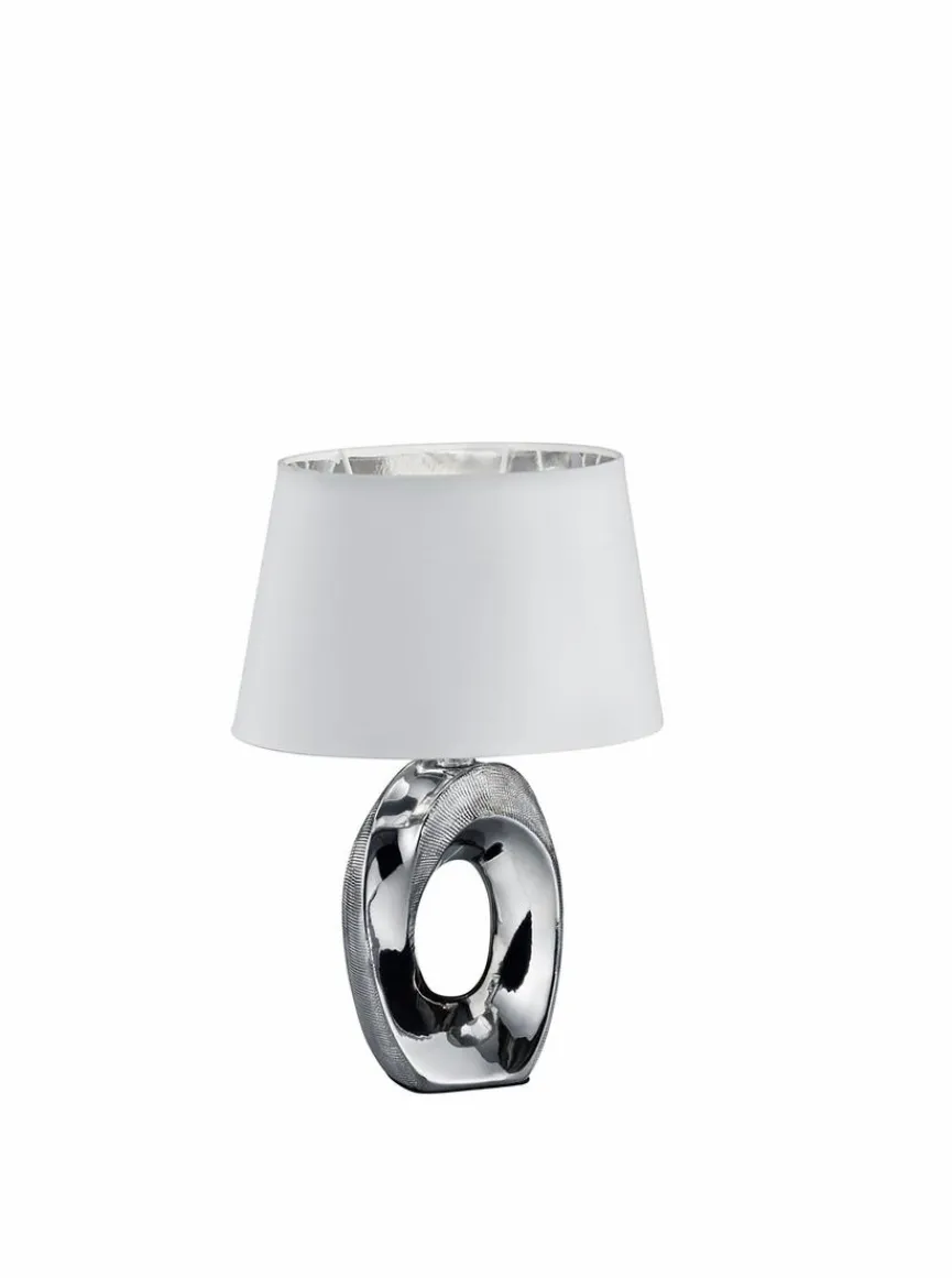 Die Tischleuchte Taba der Marke Reality Leuchten erfüllt die Funktion von Lampe und Dekoelement zugleich. Der kreisförmige, silberfarbene Fuß der Tischlampe lässt an eine Skulptur denken. An dem innen mit derselben Farbe versehenen Lampenschirm wird das Licht besonders glamourös reflektiert. Auf verschiedenen Möbelstücken oder auf der Fensterbank kann die Tischleuchte Taba von Reality Leuchten wirkungsvoll in Szene gesetzt werden.