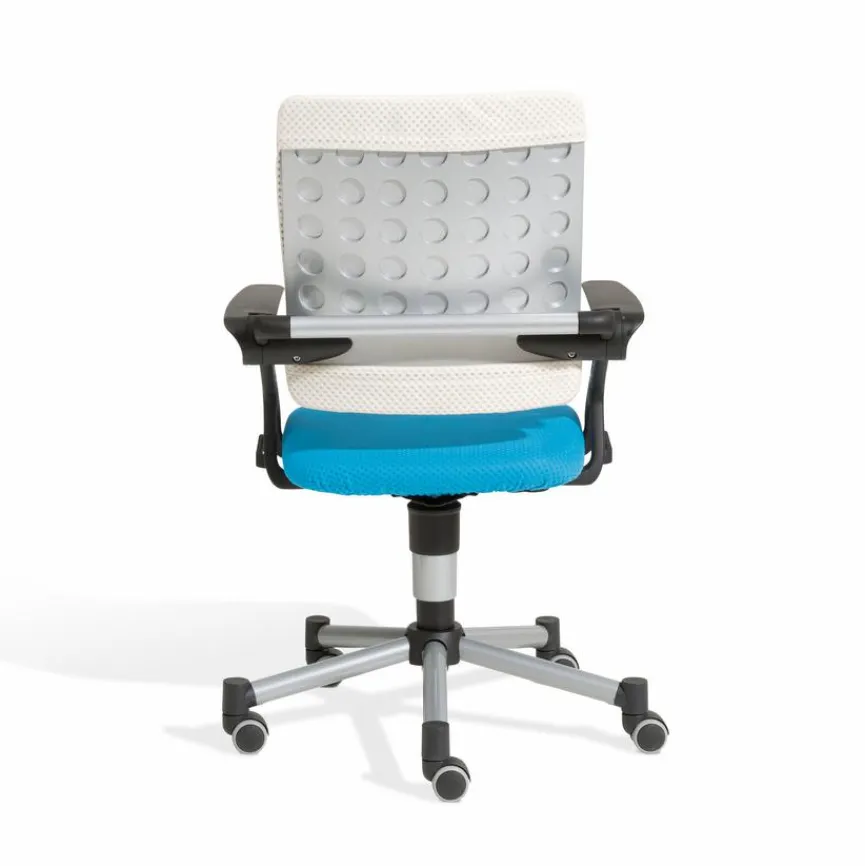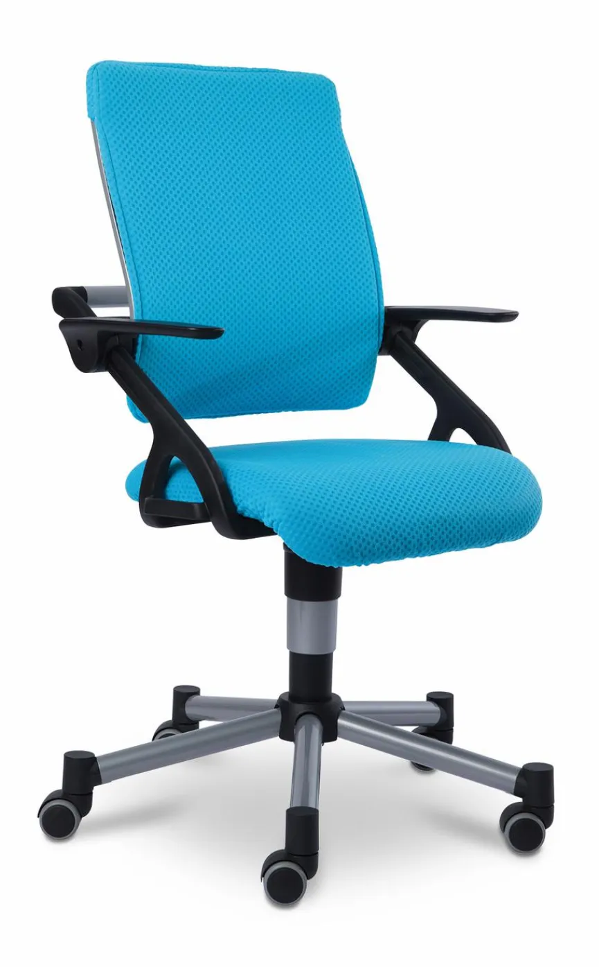 - Bezug aus Stoff in azurblau, Gestell/Fußkreuz aus Kunststoff in silbergrau, Armlehnen aus Kunststoff in schwarz