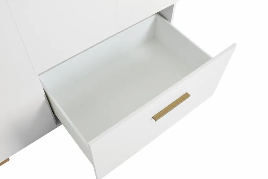 - Mit 3 Türen, 5 Einlegeböden, 2 Kleiderstangen, 1 Schubkasten und 1 Mittelwand