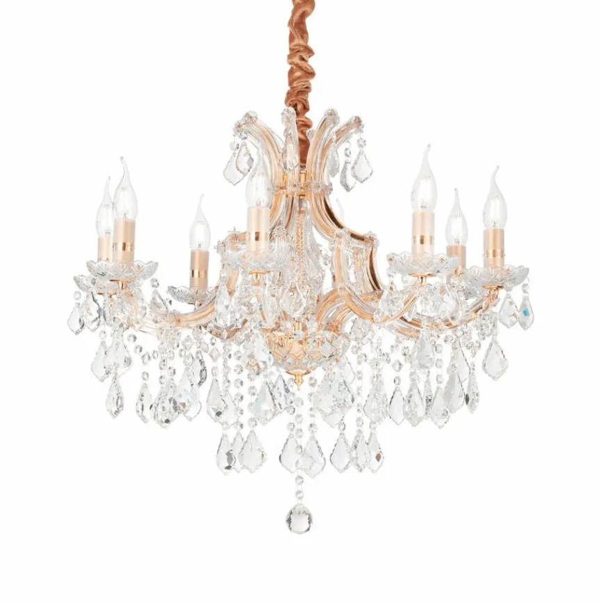 Die Pendelleuchte Napoleon von IDEAL Lux zaubert den Glanz klassischer Eleganz in Ihr Wohnzimmer. Die Pendellampe ähnelt einem edlen Kronleuchter. Geschliffenes Kristall und geblasenes Glas erzeugen eine hochklassige Wertigkeit, die jeden in ihren Bann zieht. Die filigrane Schönheit dieses Leuchters von IDEAL Lux beruht auf der Kombination seines goldfarbenen Metalles mit den Reflexen der schimmernden Kristalle. Dies verleiht der Pendelleuchte Napoleon eine beeindruckende Ausstrahlung.