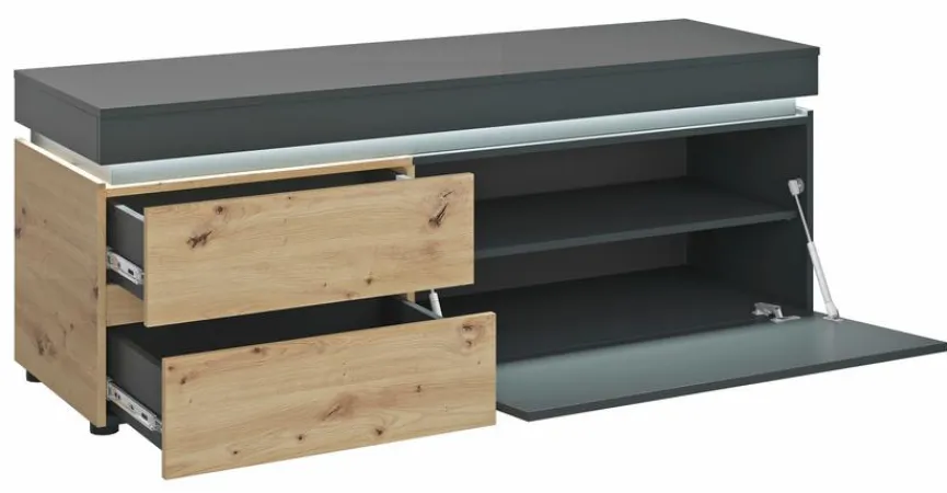 - Mit 1 Klappe, 1 Einlegeboden und 2 Schubkästen