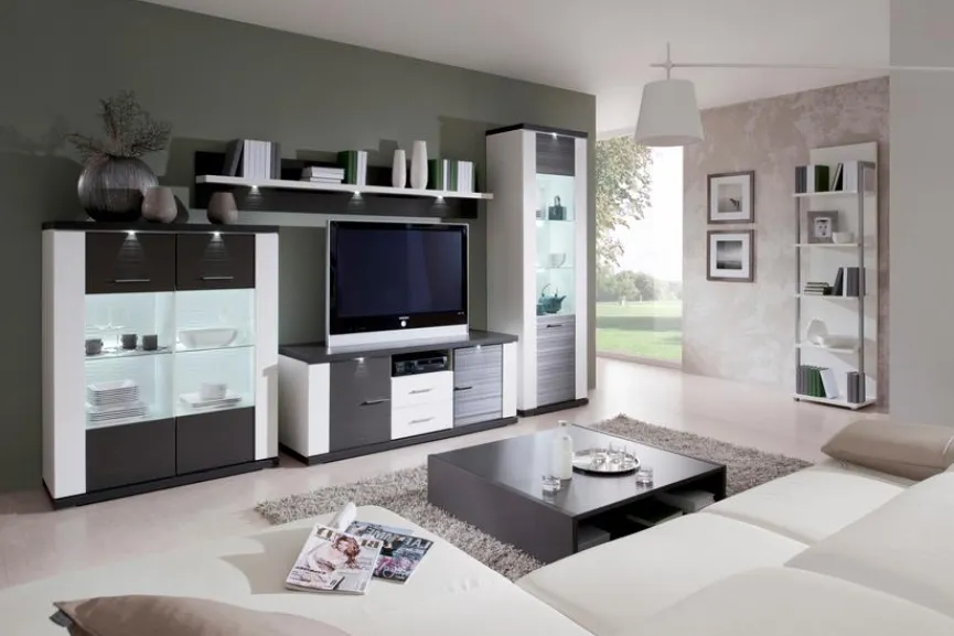 - Wohnwand bestehend aus Highboard, Lowboard, Paneel mit Boden und Vitrine