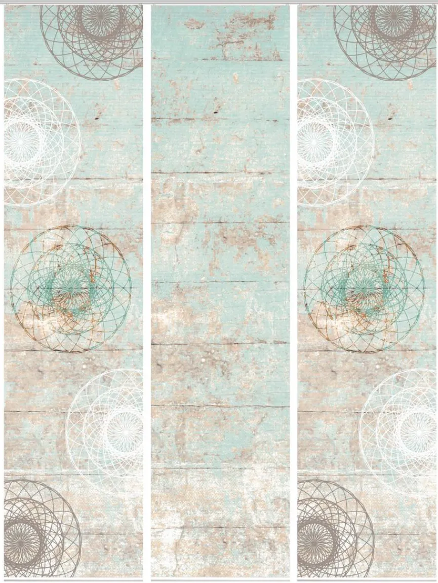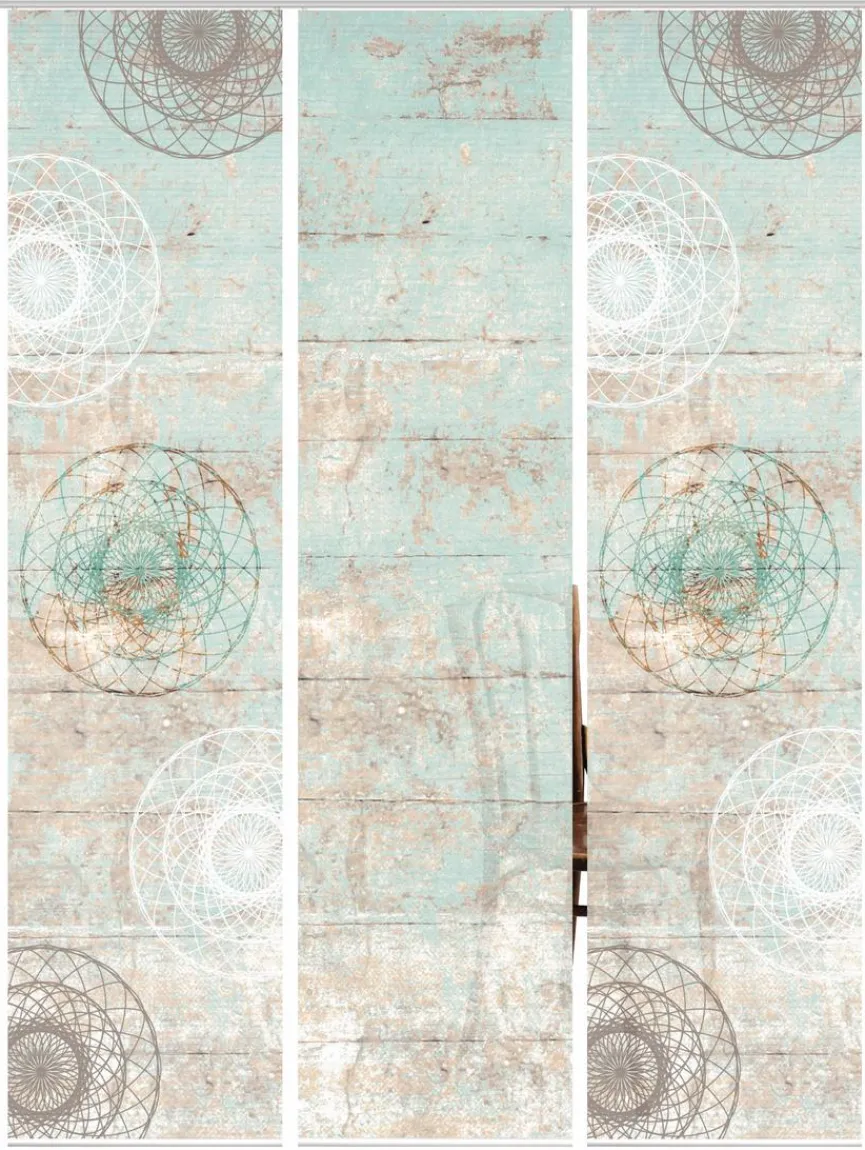 - Artikel beinhaltet drei gemusterte Schiebevorhänge, Paneelwagen inkl. Gleiter und Aluklemmleiste