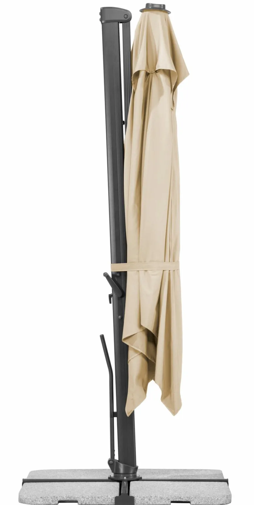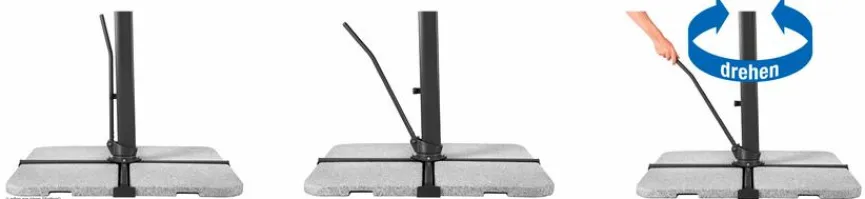 - Per Handhebel um 360 Grad drehbar, Öffnen und schließen sowie stufenlose Verstellung der Neigung am Mast