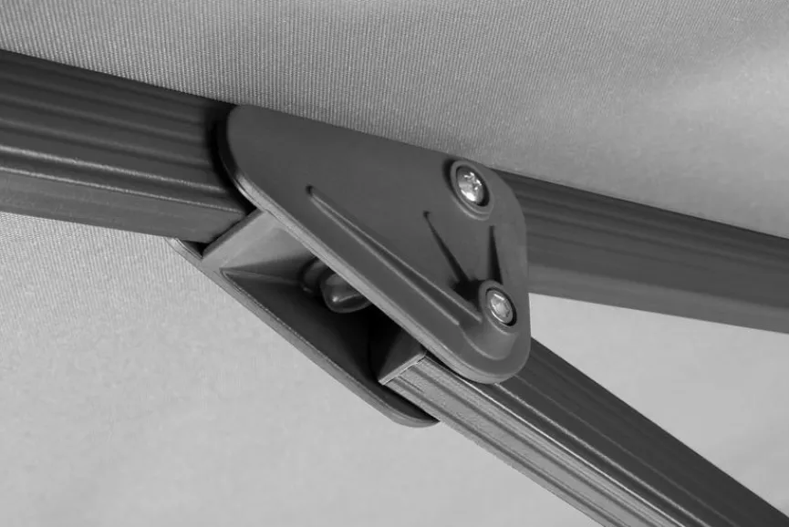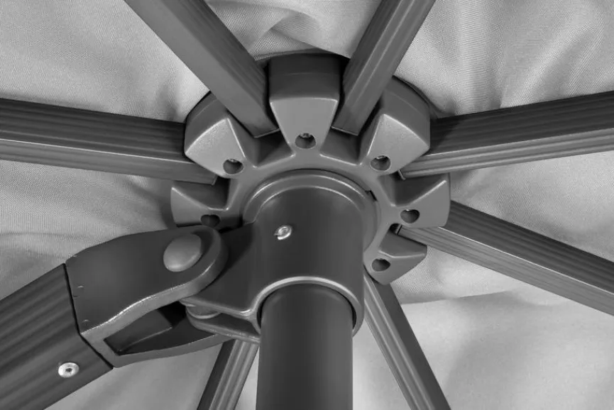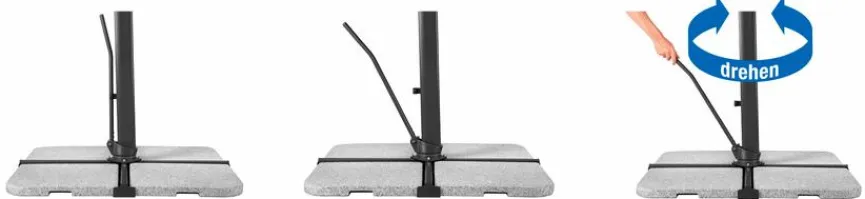 - Per Handhebel um 360 Grad drehbar, Öffnen und schließen sowie stufenlose Verstellung der Neigung am Mast