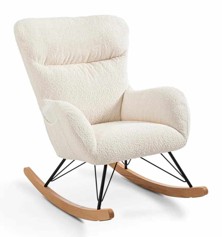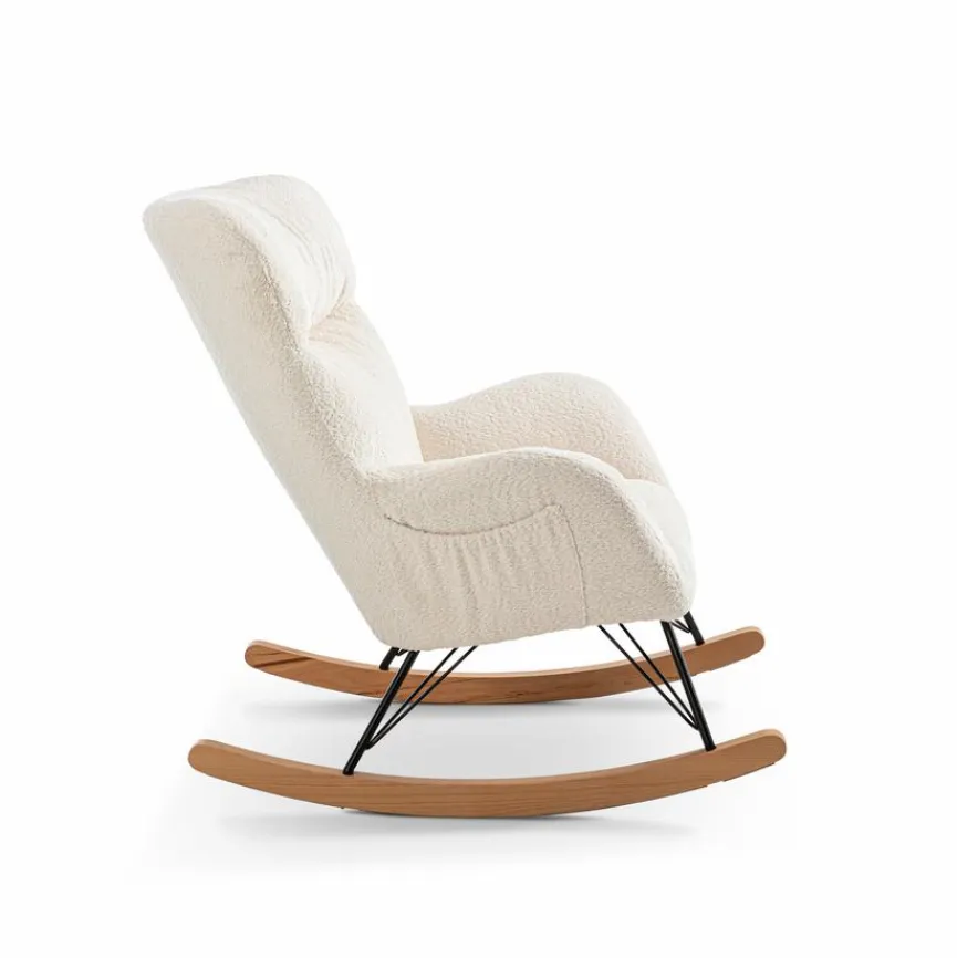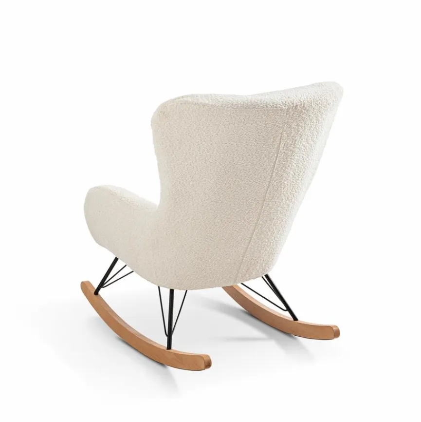 - Bezug aus Stoff in beige, Beine aus Metall in schwarz und Kufe aus Holz in Buche massiv