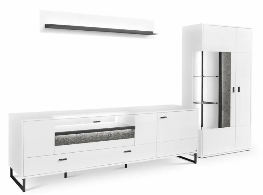 - Bestehend aus Vitrine, TV-Lowboard und Wandboard