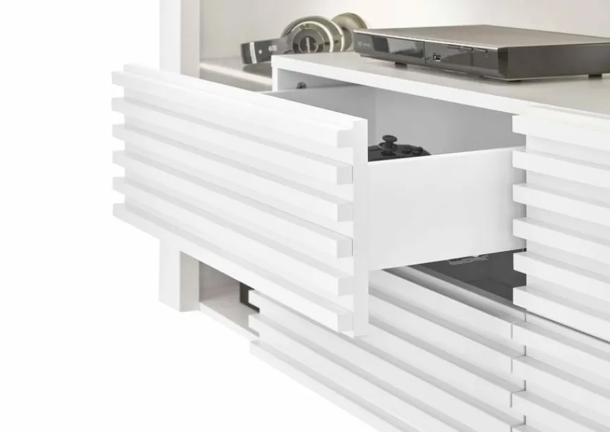 Das TV-Lowboard Goal aus dem Hause Stolkom wirkt mit seinen geradlinigen Strukturen und schlicht gehaltenen Oberflächen puristisch und modern. Schubladenfronten im Profildesign verleihen dem TV-Unterschrank eine markante Note. Wirkungsvoll kombinieren lässt sich das TV-Lowboard Goal unter anderem mit einer Vitrine, die im minimalistischen Stil gestaltet ist.