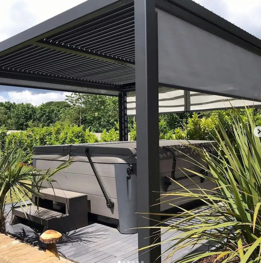 - Mit flexiblen Blenden im Dach ausgestattet, wenn die Blenden geschlossen sind, sind Sie außerdem vor Regen geschützt. Regenwasser wird über die Beine der Konstruktion abgeleitet.