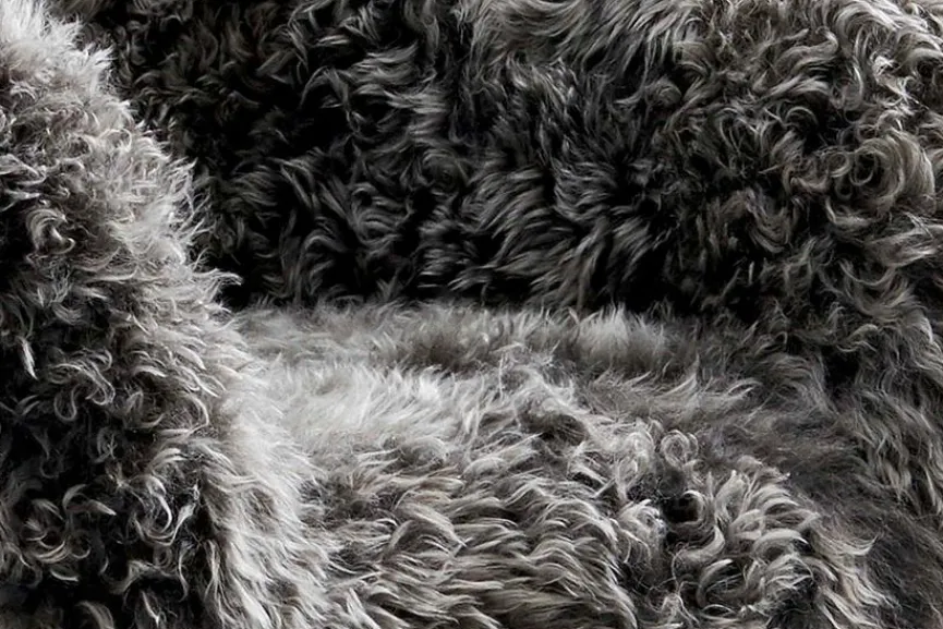 - Korpusbezug aus Leder (Cuba) in grey, Sitzbezug aus Fell (Lamb) in darkgrey, Drehteller Edelstahl