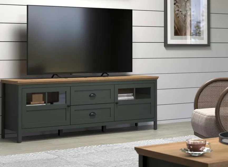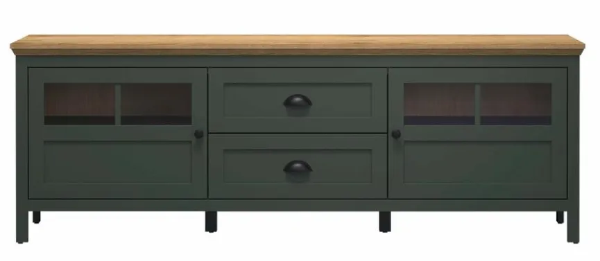 - Korpus aus Holzwerkstoff (Spanplatte) mit hochwertiger Dekorfolie in Tannengrün, Front aus Holzwerkstoff (MDF) mit hochwertiger Dekorfolie in Tannengrün