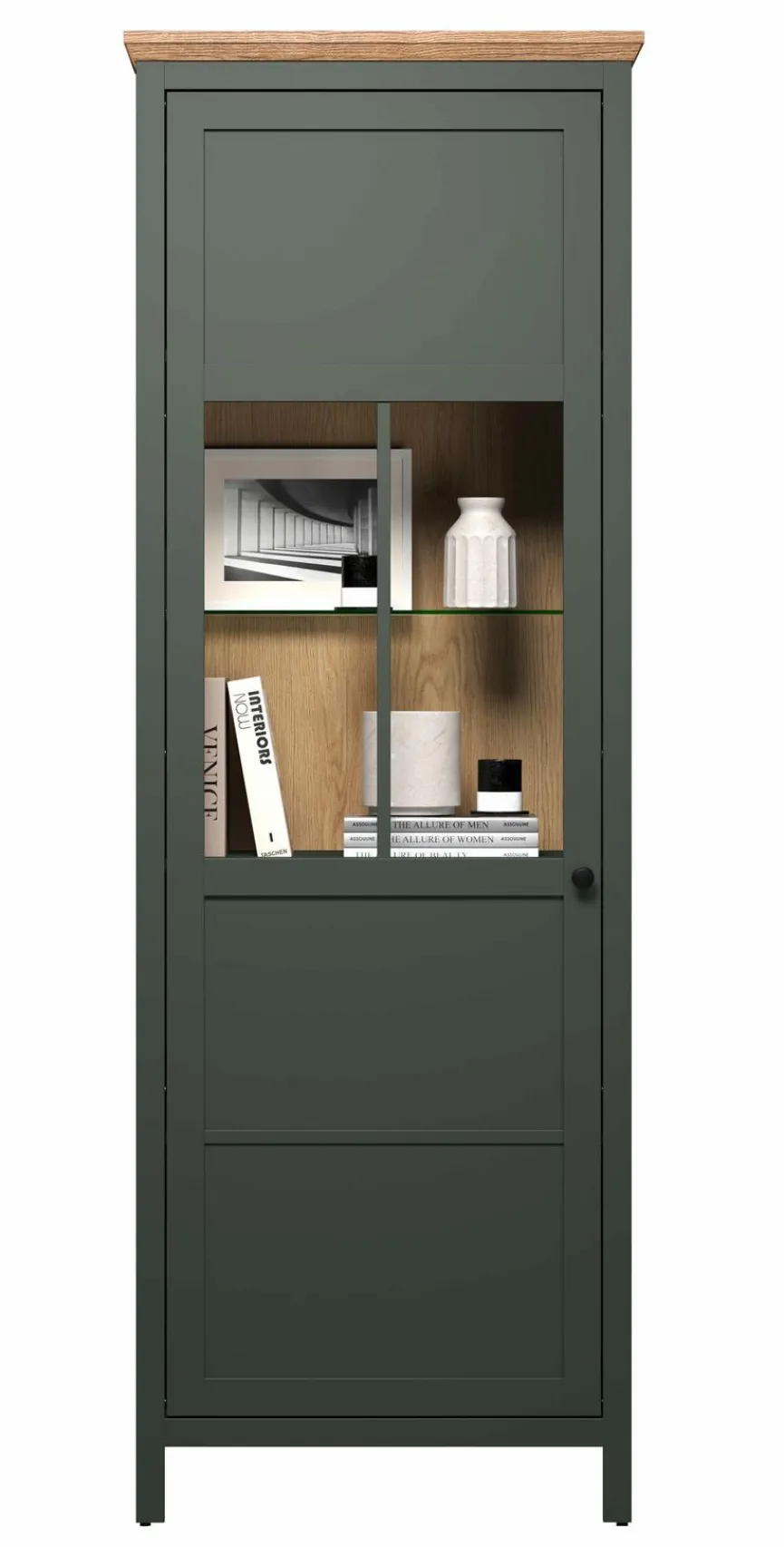 - Mit 1 Türe mit Glaseinsatz (Türanschlag links), 1 Glaseinlegeboden, 2 Einlegeböden und 1 Konstruktionsboden