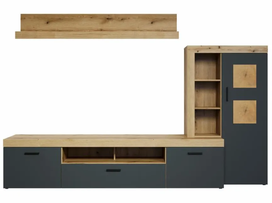 - Korpus aus Holzwerkstoff (Spanplatte) mit hochwertiger Dekorfolie in Coast Evoke Eiche Nachbildung, Front aus Holzwerkstoff (Spanplatte) mit kratzfester Melaminharzfolie in Anthrazit, Absetzung mit Hirnholzapplikation