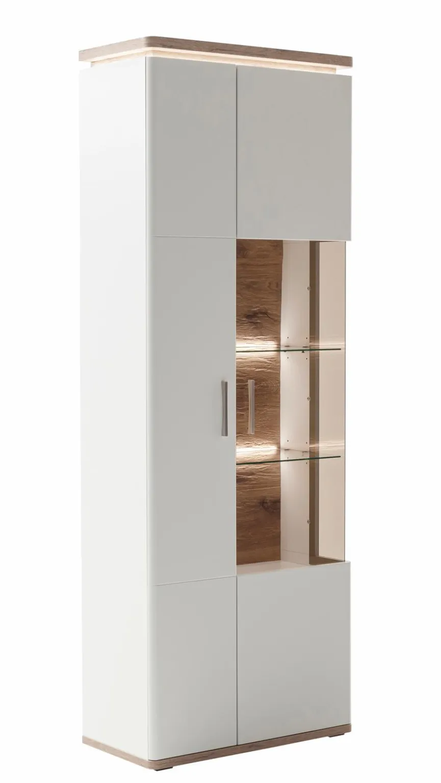 - Korpus aus Holzwerkstoff (Spanplatte) mit kratzfester Melaminharzfolie in Soft White Melamin Nachbildung, Front aus Holzwerkstoff (MDF) in Soft white Nachbildung lackiert, Absetzung aus Holzwerkstoff (Spanplatte) in Viking Oak Melamin Nachbildung