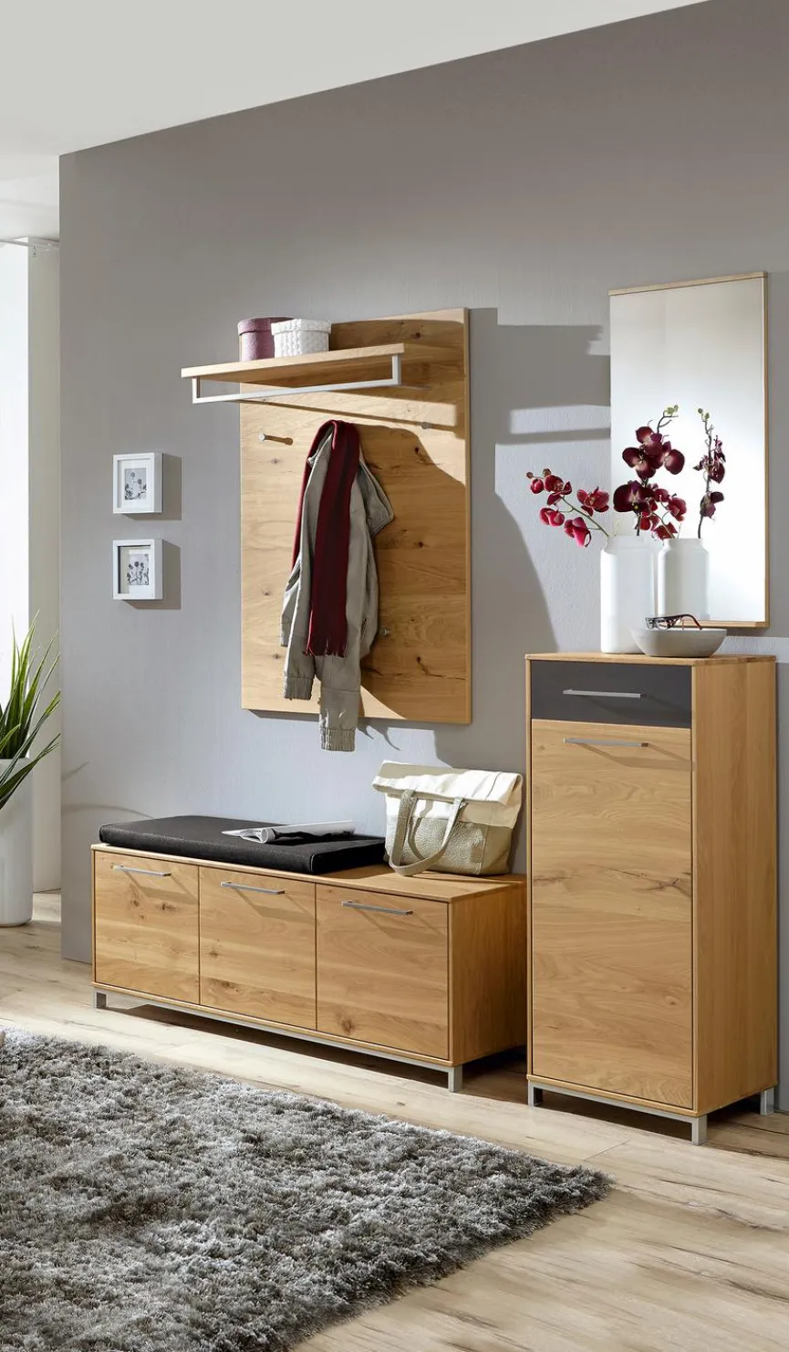 - Garderobe aus Garderobenbank, Sitzkissen, Garderobenpaneel. Schuhschrank und Spiegel