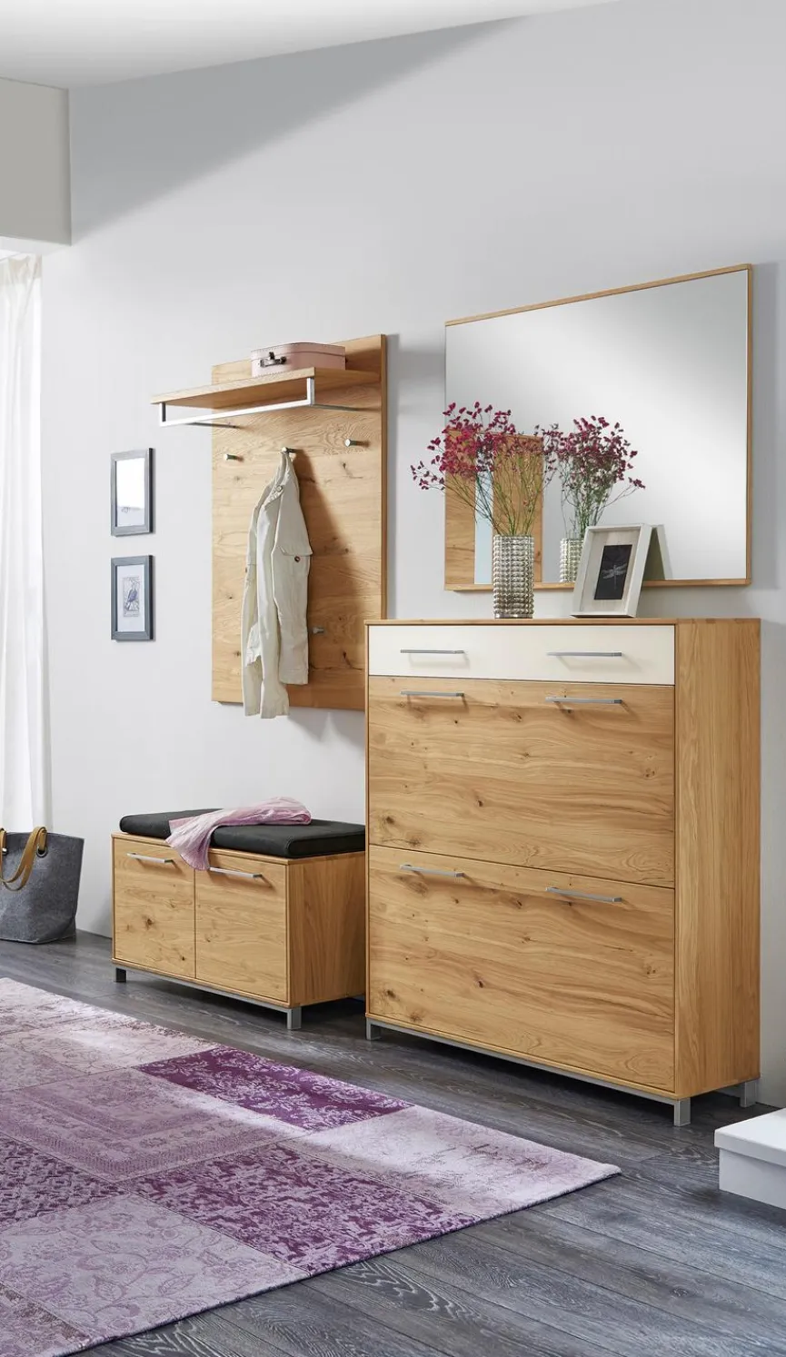 - Garderobe aus Garderobenbank, Sitzkissen, Garderobenpaneel, Schuhschrank und Spiegel