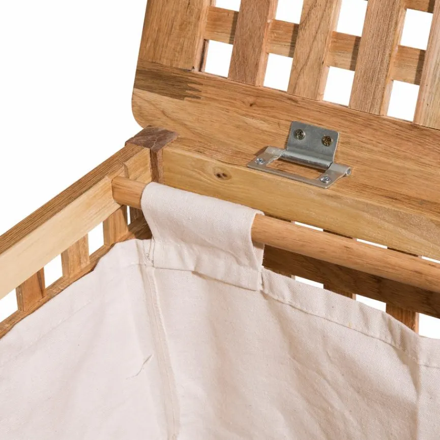 Die Truhe Tavia ist aus Massivholz gefertigt und überzeugt durch ein schickes Design. Im Inneren ist ein Wäschesack eingehängt, der problemlos herausgenommen und bei Bedarf auch gewaschen werden kann. Dank der kompakten Größe lässt sich die Truhe Tavia auch in kleineren Räumen gut unterbringen.