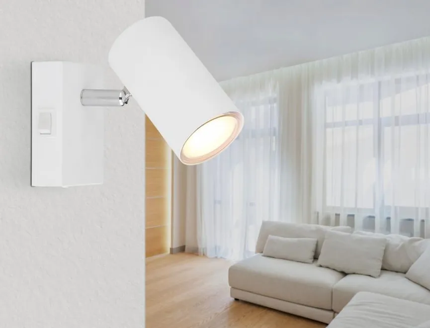 Der zylinderförmige Schirm der eleganten Wandleuchte Robby von Globo beherbergt eine GU10 Fassung. Diese erlaubt es Ihnen, dass Sie die schlichte, aber formschöne Wandlampe mit einem Leuchtmittel ausrüsten, das über eine maximale Leistung von 25 Watt verfügt. Daher sind Sie dank der dekorativen Wandleuchte Robby in der Lage, die Lichtfarbe und die Helligkeit auf Ihre Bedürfnisse abzustimmen.