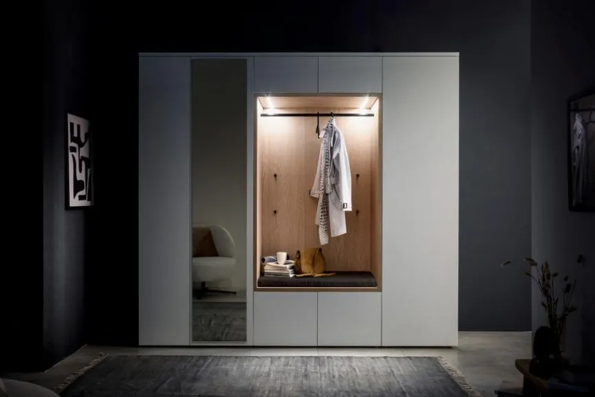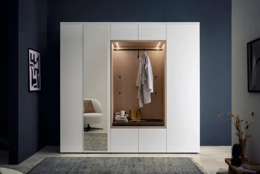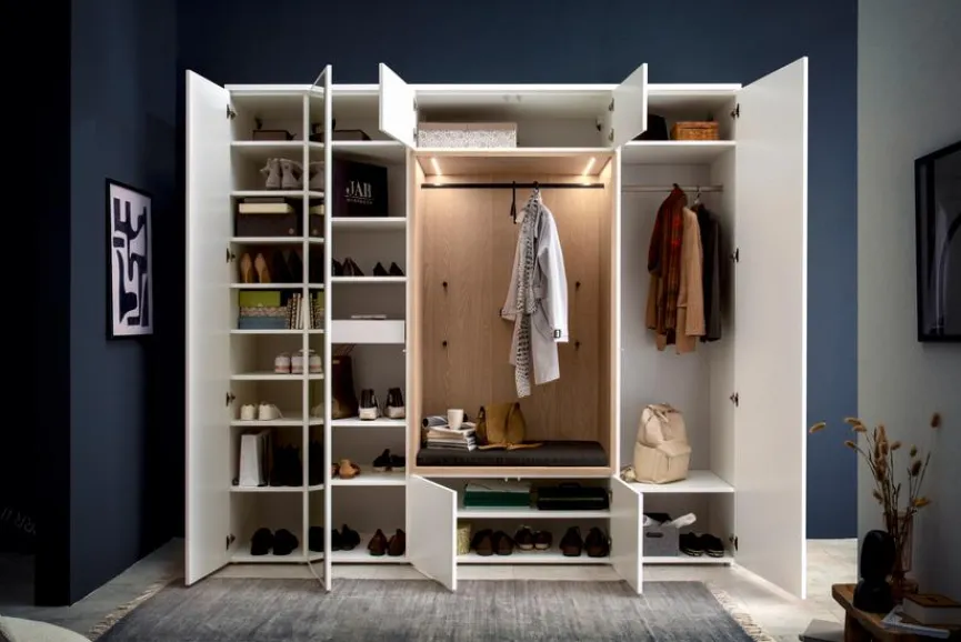 - Bestehend aus: 3 Hochschränke, 5 Fachböden, 2 Innenschubladen, 1 Unterstellschrank, 1 Garderobe, 1 Sitzkissen, 1 Aufsatz und 1 Kleiderstange