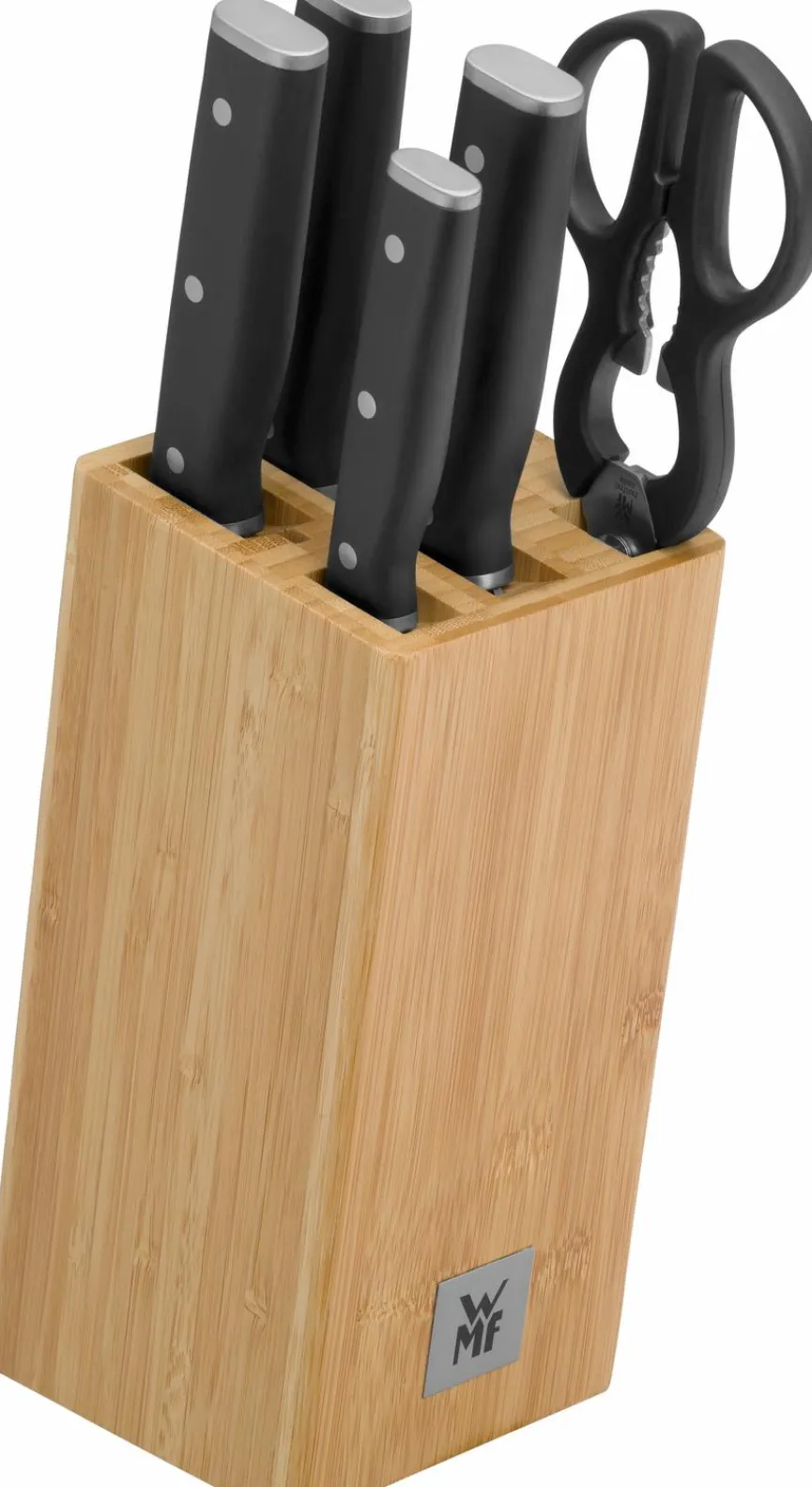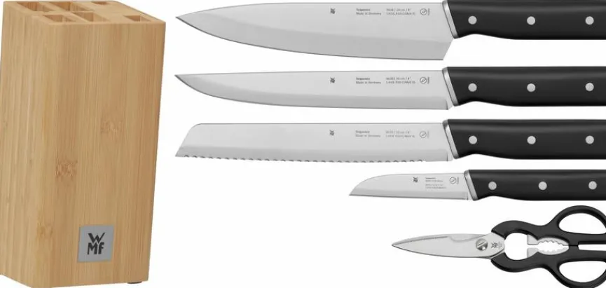 - Artikel beinhaltet je 1x Messerblock, Kochmesser 20 cm, Gemüsemesser 9 cm, Brotmesser 20 cm mit Doppelwellenschliff, Fleischmesser 20 cm und Küchenschere