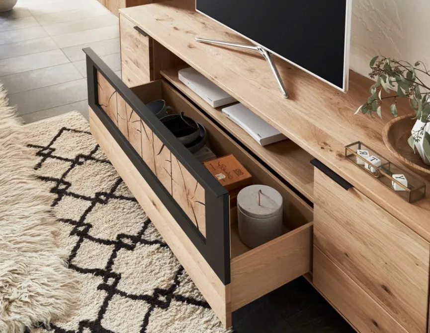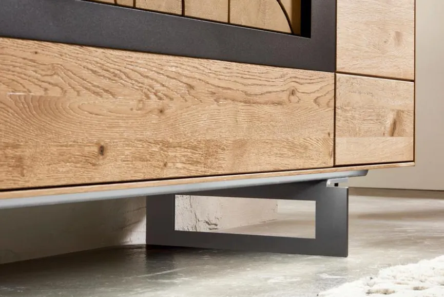 - Front und Korpus aus massiver und soft gebürsteter Wildeiche, Akzent strukturgepulvert in carbonfarbig