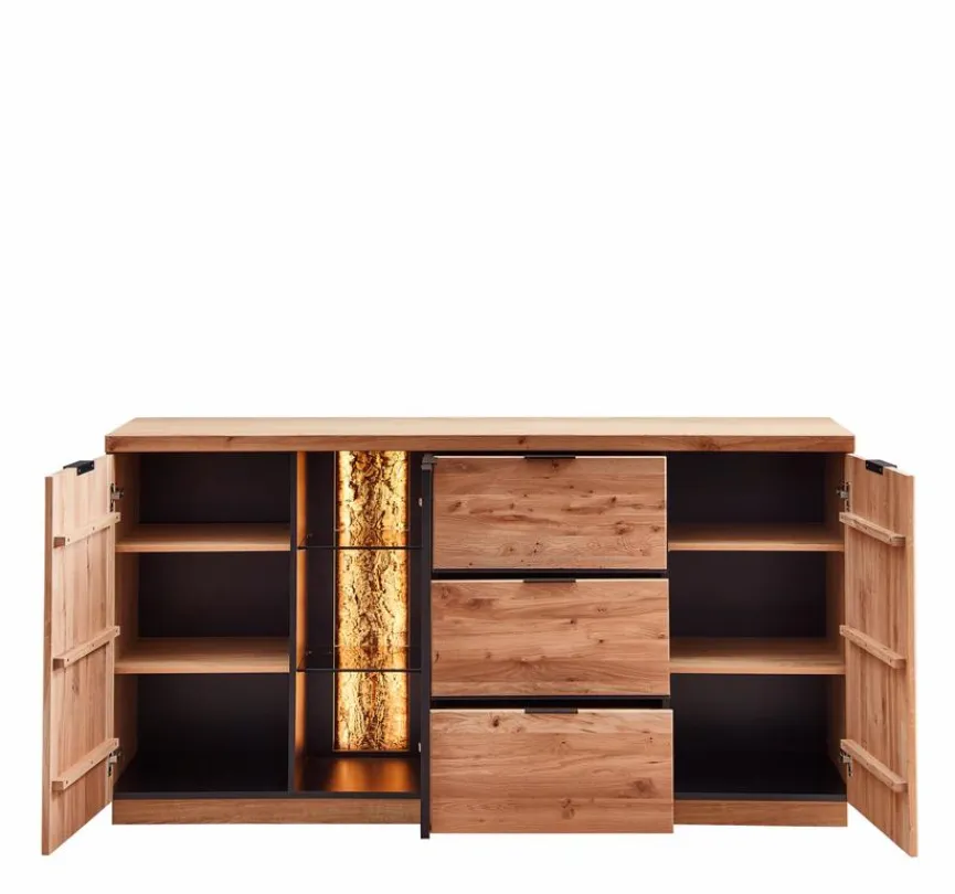 - Front aus massiver Wildeiche Bianco in gebürstet, Korpus außen aus Echtholzfurnier in Wildeiche Bianco und innen Nachbildung