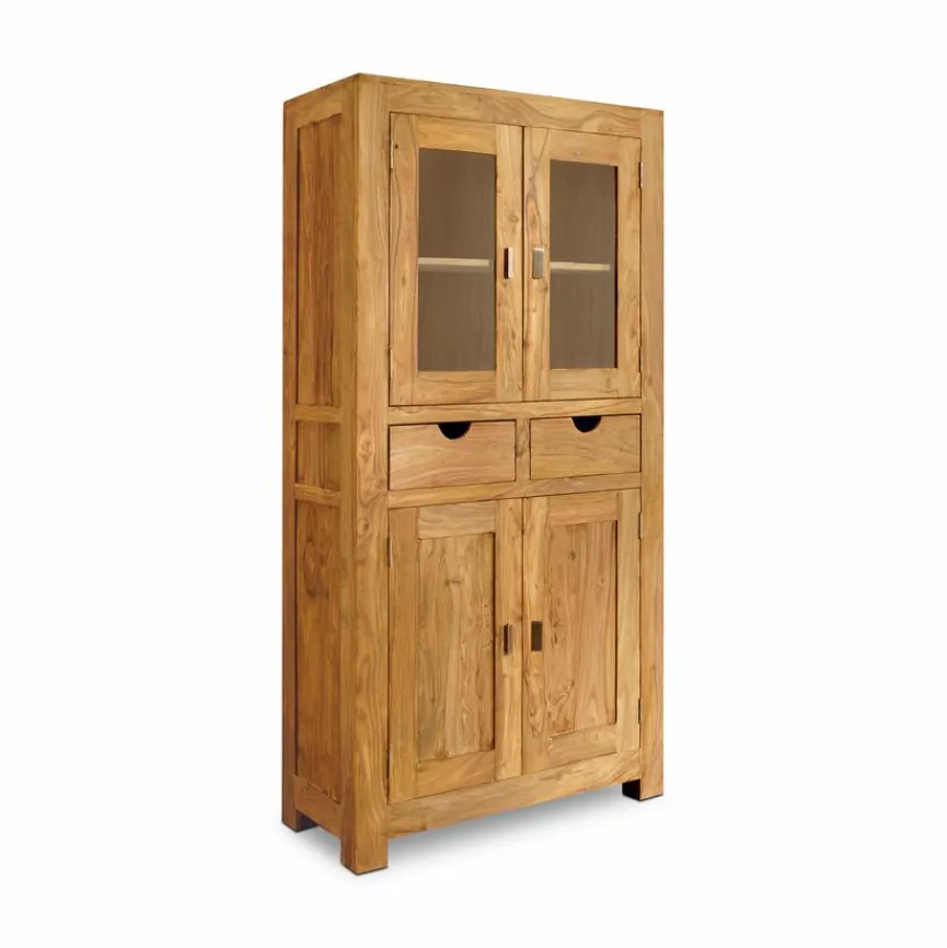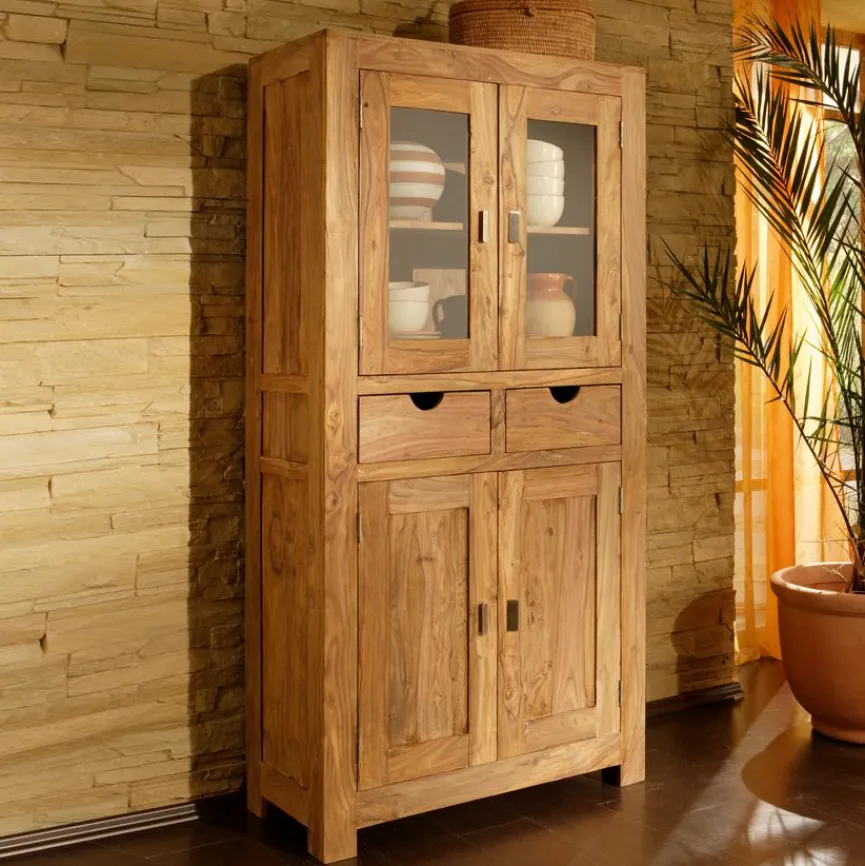 Die Vitrine Yoga ist mit ihrer charmanten Optik ein absoluter Hingucker. Durch die massive Bauweise und die Naturholzoptik erhält die Glasvitrine einen rustikalen und eleganten Look. In verschiedenen Fächern bietet die Vitrine Yoga darüber hinaus genügend Platz, um verschiedene Dinge gut geordnet aufzubewahren.